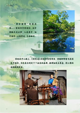 “移步換景”的拙政 園——窗欞外竹影斑駁,池中 倒映天光云影,人在其中,如 行畫(huà)中,心隨景動(dòng),塵慮頓消。 傍晚的平江路上,《琵琶語(yǔ)》的旋律悠悠傳來(lái),清越的琴音與潺潺 水聲相和,為這座水城定下了溫柔的基調。曲調如珠玉落盤(pán),將江南的 溫婉娓娓道來(lái)。 57